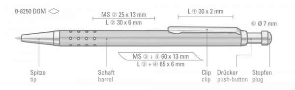Metall-Druckkugelschreiber mit Metallbeschlagteilen glanzverchromt, gestanzter Griffzone und Drücker mit individuell gestaltetem Doming. Minentype: uma Economy Class Refill Minenfarbe: schwarz