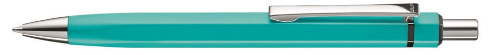 Metall-Druckkugelschreiber mit farbigem matt lackiertem, sechskantigem Aluminiumschaft. Metallclip, Metallspitze und Drücker in silber glänzend. Zierring in schwarz glänzend.