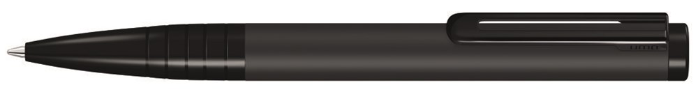 Metall-Drehkugelschreiber mit mattem Gehäuse, Clip, Spitze mit eingelassener Griffzone und Drücker in schwarz glänzend.