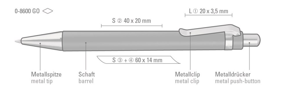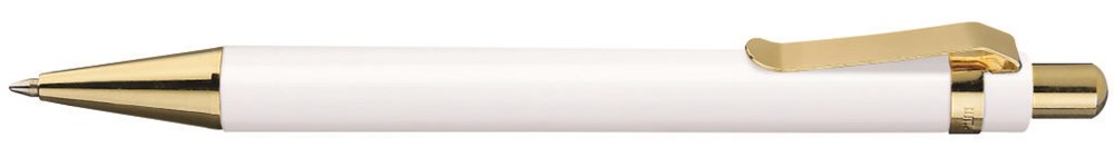 Druckkugelschreiber mit schwarzem oder weißem Schaft. Drücker, Clip und Spitze aus vergoldetem Metall. Minentype: uma Tech Refill 1.0, schwarzes Rohr Minenfarbe: schwarz