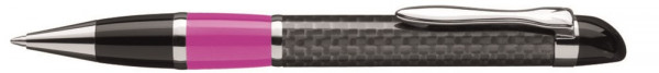 Edler Carbonfaser-Drehkugel- schreiber mit flexiblem, glanzverchromtem Metallclip, Metallzierringen, Metallspitze und farbiger Griffzone.
