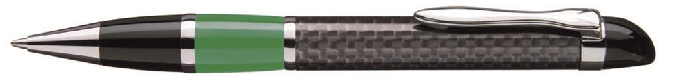 Edler Carbonfaser-Drehkugel- schreiber mit flexiblem, glanzverchromtem Metallclip, Metallzierringen, Metallspitze und farbiger Griffzone.