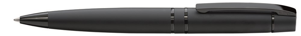 Metall-Drehkugelschreiber mit Softtouch-Gehäuse, Softdrehmechanik und gefedertem Clip. Beschlagteile schwarz glänzend lackiert. Minentype: uma Extra Class Refill Minenfarbe: blau