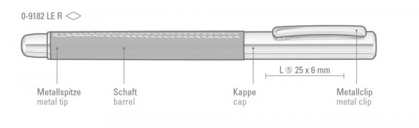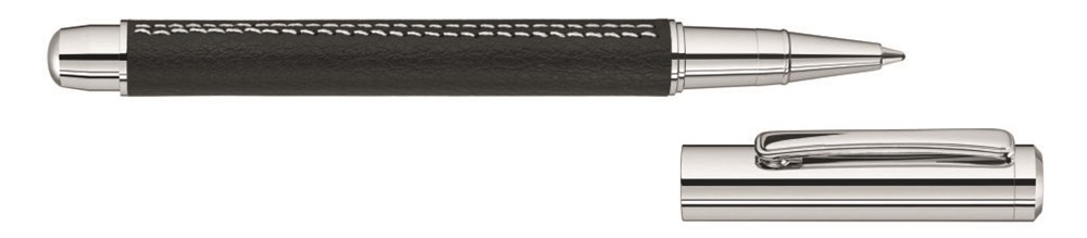 Metall-Rollerball mit Lederschaft und weißen Ziernähten. Oberteil und Beschläge glanzverchromt. Minentype: uma High Class Rollerball Refill Minenfarbe: schwarz