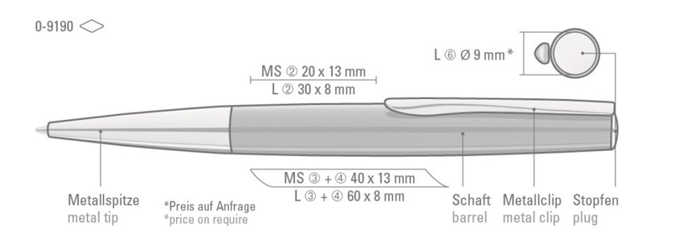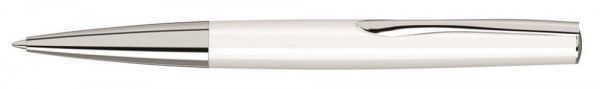 Metall-Drehkugelschreiber mit gedeckt glänzendem Gehäuse in schwarz oder weiß, gefederter Metallclip und schwere Metallspitze glanzverchromt. Minentype: uma Extra Class Refill Minenfarbe: blau