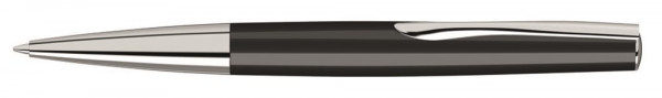 Metall-Drehkugelschreiber mit gedeckt glänzendem Gehäuse in schwarz oder weiß, gefederter Metallclip und schwere Metallspitze glanzverchromt.