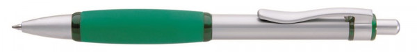 Metall-Druckkugelschreiber mit glänzend verchromtem, lackiertem Schaft, Drücker, Clip und Spitze. Weiche, große Gummigriffzone und transparente Zierringe unifarben.