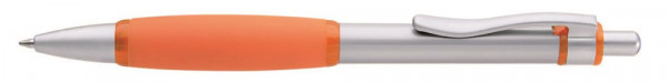 Metall-Druckkugelschreiber mit glänzend verchromtem, lackiertem Schaft, Drücker, Clip und Spitze. Weiche, große Gummigriffzone und transparente Zierringe unifarben.