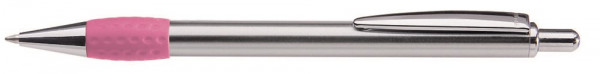 Metall-Druckkugelschreiber mit glanz verchromtem, lackiertem Schaft, Drücker, Clip und Spitze. Gummigriffzone farbig.