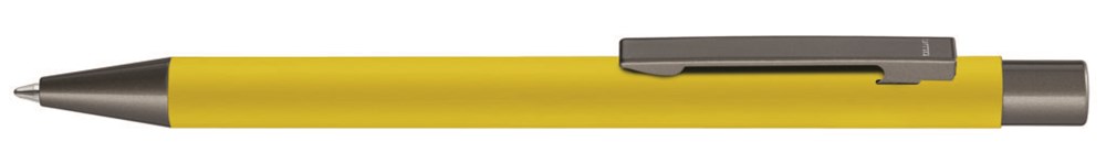 Metall-Druckkugelschreiber mit Softtouch-Schaft, Metallclip, Metallspitze und Drücker in Gun metallic. Minentype: uma Tech Refill 1.0, schwarzes Rohr Minenfarbe: blau