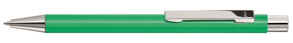 Metall-Druckkugelschreiber mit matter Oberfläche, Metallclip, Metallspitze und Drücker in silber glänzend. Minentype: uma Tech Refill 1.0, schwarzes Rohr Minenfarbe: blau