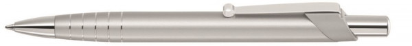 Metalldruckkugelschreiber mit silbernen Zierringen im Schaft, elastischer Metallclip. Spitze und Drücker in silber glänzend.