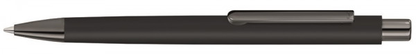 Metall-Druckkugelschreiber mit ellipsenförmigem Softtouch-Schaft, Metallclip, Metallspitze und ellipsenförmiger Drücker in GUN metallic. Hier geht´s zum Video: https://uma-pen.com/formsprache Minentype: uma Tech Refill 1.0, schwarzes Rohr Minenfarbe: blau