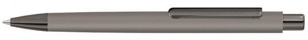 Metall-Druckkugelschreiber mit ellipsenförmigem Softtouch-Schaft, Metallclip, Metallspitze und ellipsenförmiger Drücker in GUN metallic. Hier geht´s zum Video: https://uma-pen.com/formsprache