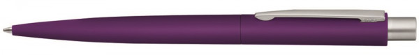 Metall-Druckkugelschreiber mit matt gummiertem farbigem Gehäuse. Metallclip und Drücker matt verchromt.