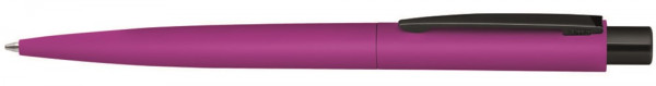 Metall-Druckkugelschreiber mit matt gummiertem farbigem Gehäuse. Metallclip und Drücker schwarz glänzend.