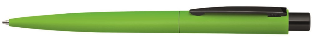 Metall-Druckkugelschreiber mit matt gummiertem farbigem Gehäuse. Metallclip und Drücker schwarz glänzend.