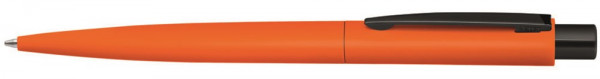Metall-Druckkugelschreiber mit matt gummiertem farbigem Gehäuse. Metallclip und Drücker schwarz glänzend.