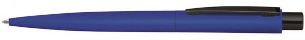 Metall-Druckkugelschreiber mit matt gummiertem farbigem Gehäuse. Metallclip und Drücker schwarz glänzend.