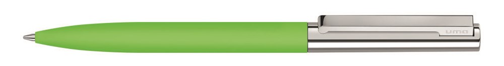 Metall-Drehkugelschreiber mit glanzverchromtem Metalloberteil und gefedertem Metallclip. Schaft matt gummiert in verschiedenen Farben.