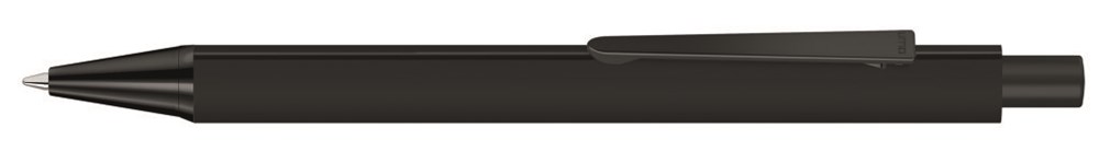 Metall-Druckkugelschreiber mit gummiertem Dreikantgehäuse, Metallclip, Metallspitze und Drücker in schwarz matt. Hier geht´s zum Video: https://uma-pen.com/formsprache Minentype: uma Tech Refill 1.0, schwarzes Rohr Minenfarbe: blau