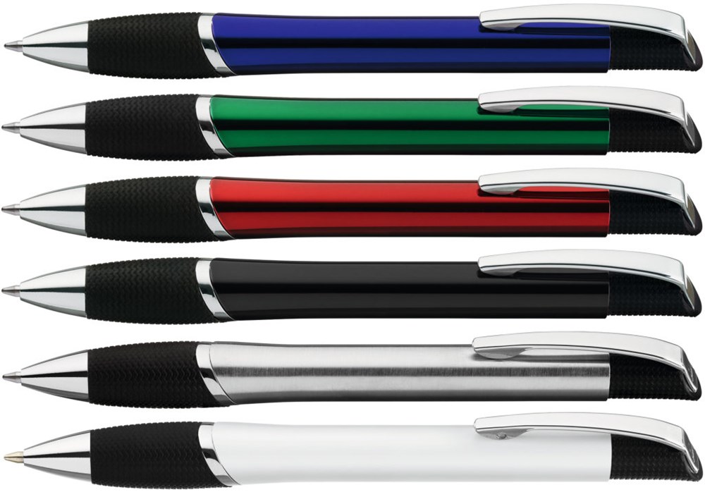 Metall-Druckkugelschreiber mit Gummigriffzone und glanzverchromten Beschlagteilen.
