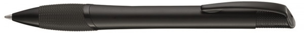 Metall-Druckkugelschreiber mit farbiger Gummigriffzone, schwarz matt lackiertem Gehäuse und Beschlägen.