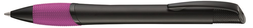 Metall-Druckkugelschreiber mit farbiger Gummigriffzone, schwarz matt lackiertem Gehäuse und Beschlägen.