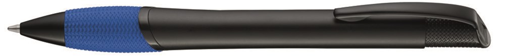Metall-Druckkugelschreiber mit farbiger Gummigriffzone, schwarz matt lackiertem Gehäuse und Beschlägen. Minentype: uma Extra Class Refill Minenfarbe: blau