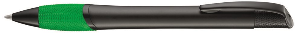 Metall-Druckkugelschreiber mit farbiger Gummigriffzone, schwarz matt lackiertem Gehäuse und Beschlägen.