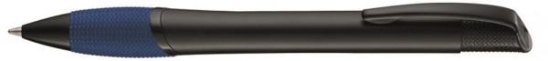 Metall-Druckkugelschreiber mit farbiger Gummigriffzone, schwarz matt lackiertem Gehäuse und Beschlägen.