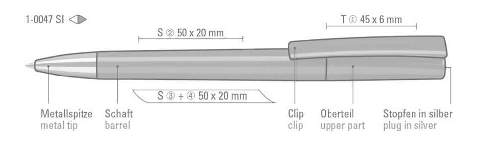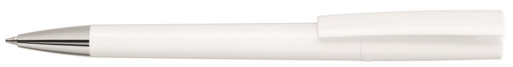 Drehkugelschreiber mit weiß oder schwarz glänzend gedecktem Gehäuse, silbernem Stopfen im Oberteil und schwerer Metallspitze glanzverchromt. BlackForestPen – Designed in Deutschland, gefertigt in der Schweiz, zusammengefügt und veredelt im Schwarzwald. Minentype: uma Tech Refill 1.0, schwarzes Rohr Minenfarbe: blau