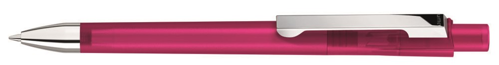 Druckkugelschreiber in transparent gefrosteten Gehäusefarben, Metallclip und schwere Metallspitze glanzverchromt.