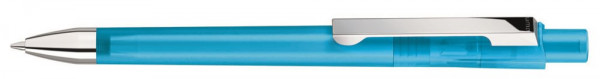 Druckkugelschreiber in transparent gefrosteten Gehäusefarben, Metallclip und schwere Metallspitze glanzverchromt.