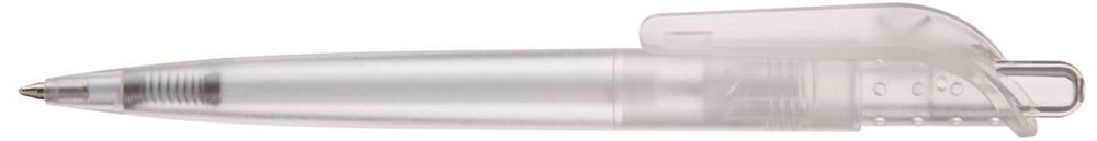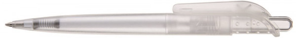 Druckkugelschreiber mit transparent gefrostetem Schaft und großem Clip an genoppter Clipaufhängung. Designed in Deutschland, gefertigt in der Schweiz, zusammengefügt und veredelt im Schwarzwald.