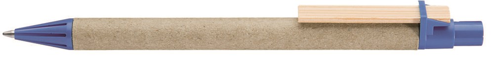 Druckkugelschreiber aus recycelter, naturfarbener Pappe. Spitze und Drücker unifarben aus recyceltem oder biologisch (Bio-Mix) abbaubarem Kunststoff sowie Holzclip.