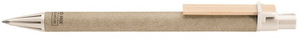 Druckkugelschreiber aus recycelter, naturfarbener Pappe. Spitze und Drücker unifarben aus recyceltem oder biologisch (Bio-Mix) abbaubarem Kunststoff sowie Holzclip.