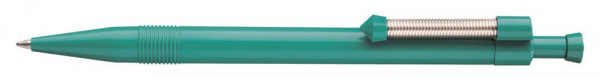 Druckkugelschreiber mit flexiblem und vernickeltem Metallfederclip.