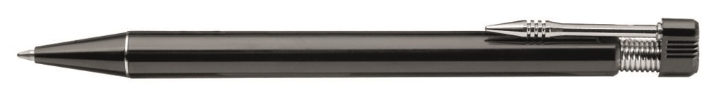 Druckkugelschreiber mit vernickeltem Metallclip sowie beweglichem Drückerkopf auf vernickelter Metallfeder. Minentype: uma Tech Refill 1.0, schwarzes Rohr Minenfarbe: blau