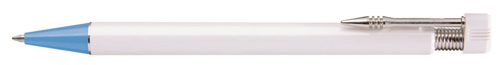 Druckkugelschreiber mit vernickeltem Metallclip sowie beweglichem Drückerkopf auf vernickelter Metallfeder.