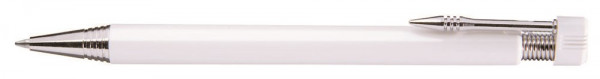 Druckkugelschreiber mit beweglichem Drückerkopf auf vernickelter Metallfeder. Vernickelter Metallclip, Zierring und Metallspitze.