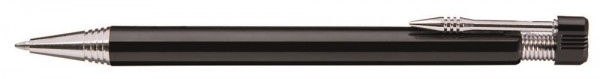 Druckkugelschreiber mit beweglichem Drückerkopf auf vernickelter Metallfeder. Vernickelter Metallclip, Zierring und Metallspitze.