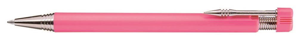 Druckkugelschreiber mit beweglichem Drückerkopf auf vernickelter Metallfeder. Vernickelter Metallclip, Zierring und Metallspitze.