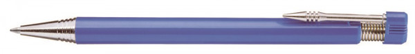 Druckkugelschreiber mit beweglichem Drückerkopf auf vernickelter Metallfeder. Vernickelter Metallclip, Zierring und Metallspitze.