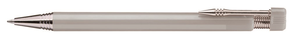 Druckkugelschreiber mit beweglichem Drückerkopf auf vernickelter Metallfeder. Vernickelter Metallclip, Zierring und Metallspitze.