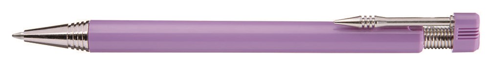 Druckkugelschreiber mit beweglichem Drückerkopf auf vernickelter Metallfeder. Vernickelter Metallclip, Zierring und Metallspitze.