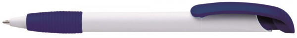 Druckkugelschreiber mit Bogen­clipdrücker und Gummigriffzone.