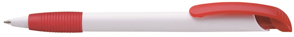 Druckkugelschreiber mit Bogen­clipdrücker und Gummigriffzone.