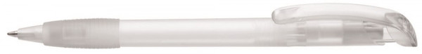 Druckkugelschreiber mit transparent gefrostetem Gehäuse, Gummigriffzone und Bogenclipdrücker.