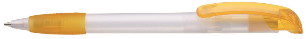 Druckkugelschreiber mit transparent gefrostetem Gehäuse, Gummigriffzone und Bogenclipdrücker.